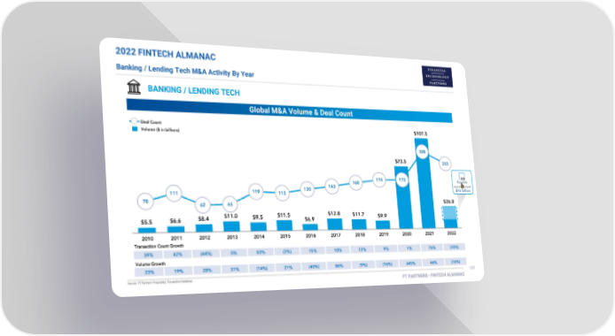 2022 FINTECH ALMANAC Banking / Lending Tech M&A Activity By Year BANKING / LENDING TECH Global M&A Volume & Deal Count 400 350 300 250 200 150 100 50 - (50)