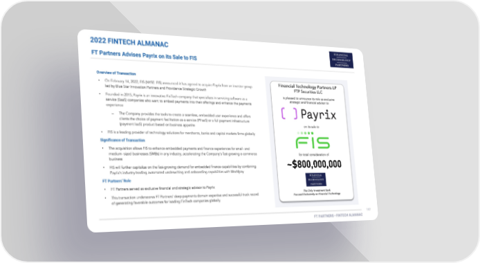 FT Partners 2022 FinTech Almanac Page 196 Page 1982022 FINTECH ALMANAC FT Partners Advises Payrix on its Sale to FIS Overview of Transaction • • ̶ • Significance of Transaction • • FT Partners’ Role • •