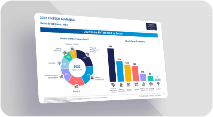 2022 FINTECH ALMANAC Sector Breakdowns: M&A 2022 Global FinTech M&A by Sector (1) Number of M&A Transactions M&A Volume ($ in billions) 50 45 40 35 30 25 20 15 10 5 0