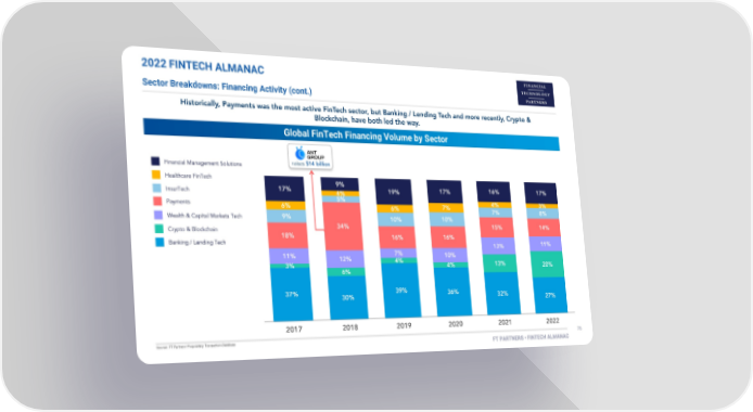 2022 FINTECH ALMANAC Sector Breakdowns: Financing Activity (cont.) Global FinTech Financing Volume by Sector 100.0% 90.0% 80.0% 70.0% 60.0% 50.0% 40.0% 30.0% 20.0% 10.0% 0.0%