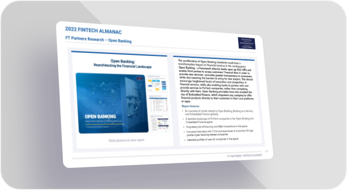 2022 FINTECH ALMANAC FT Partners Research – Open Banking Open Banking: Rearchitecting the Financial Landscape • • • • Click pictures to view report •