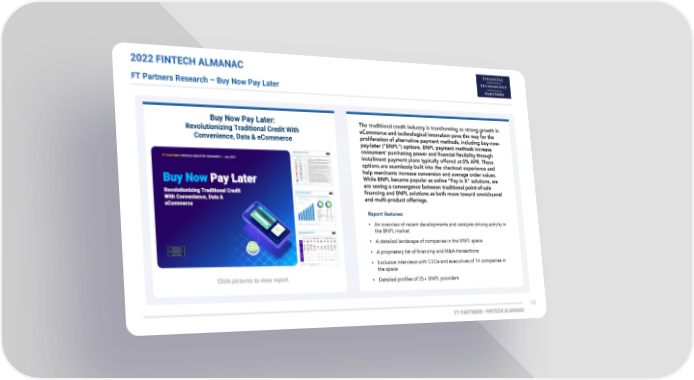 2022 FINTECH ALMANAC FT Partners Research – Buy Now Pay Later Buy Now Pay Later: Revolutionizing Traditional Credit With Convenience, Data & eCommerce • • • • Click pictures to view report •