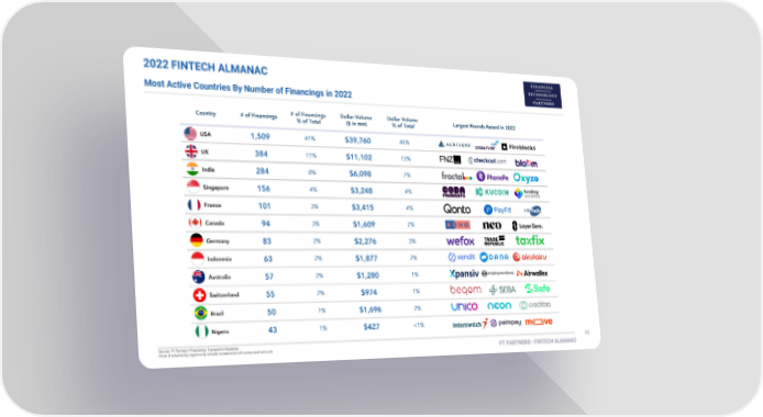 2022 FINTECH ALMANAC Most Active Countries By Number of Financings in 2022 FT Partners 2022 FinTech Almanac Page 41 Page 43