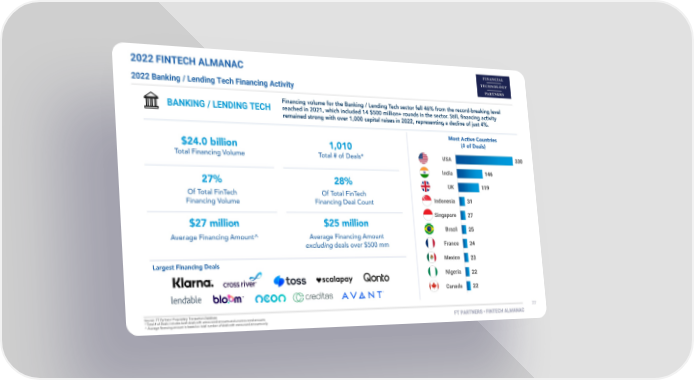 FT Partners 2022 FinTech Almanac Page 76 Page 782022 FINTECH ALMANAC 2022 Banking / Lending Tech Financing Activity BANKING / LENDING TECH USA 330 India 146 UK 119 Indonesia 31 Singapore 27 Brazil 25 France 24 Mexico 23 Nigeria 22 Canada 22