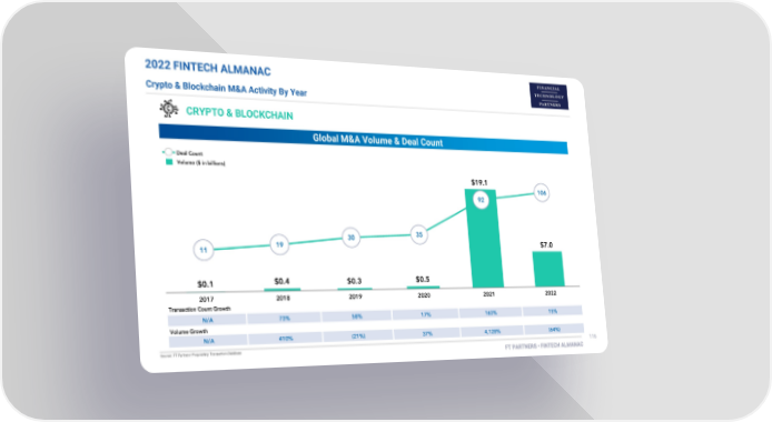 2022 FINTECH ALMANAC Crypto & Blockchain M&A Activity By Year CRYPTO & BLOCKCHAIN Global M&A Volume & Deal Count 150 130 110 90 70 50 30 10 (10) (30) (50)
