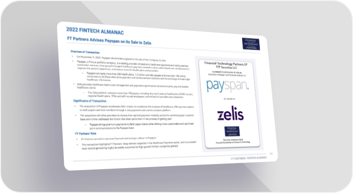 FT Partners 2022 FinTech Almanac Page 182 Page 1842022 FINTECH ALMANAC FT Partners Advises Payspan on its Sale to Zelis Overview of Transaction • • • Significance of Transaction • • FT Partners’ Role • •