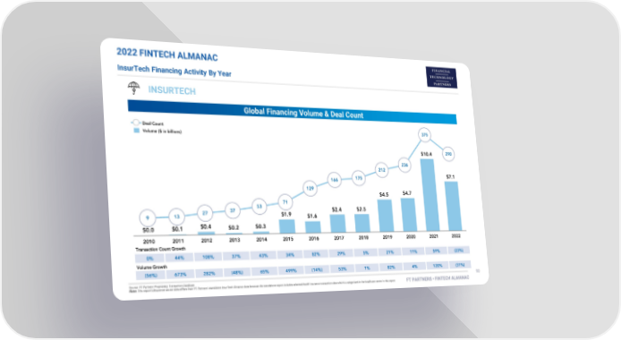 2022 FINTECH ALMANAC InsurTech Financing Activity By Year INSURTECH Global Financing Volume & Deal Count 340 290 240 190 140 90 40 (10) (60)
