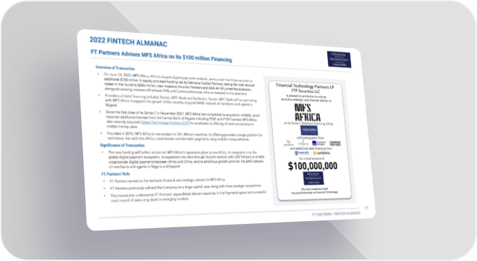 2022 FINTECH ALMANAC FT Partners Advises MFS Africa on its $100 million Financing Overview of Transaction • • • • Significance of Transaction • FT Partners’ Role • • •