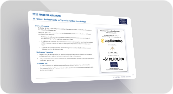 2022 FINTECH ALMANAC FT Partners Advises Capital on Tap on its Funding from Atalaya Overview of Transaction • • Significance of Transaction • • FT Partners’ Role • •