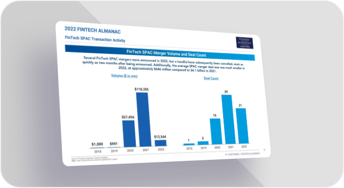 2022 FINTECH ALMANAC FinTech SPAC Transaction Activity FinTech SPAC Merger Volume and Deal Count $140,000.0 35 $120,000.0 30 $100,000.0 25 $80,000.0 20 $60,000.0 15 $40,000.0 10 $20,000.0 5 $0.0 -