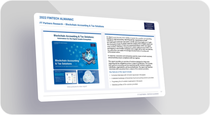 2022 FINTECH ALMANAC FT Partners Research – Blockchain Accounting & Tax Solutions Blockchain Accounting & Tax Solutions: Automation for the Digital Assets Ecosystem • • • Click pictures to view report •