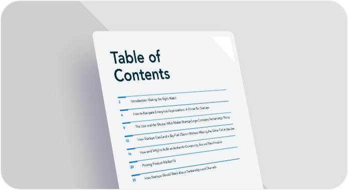Table of Contents 3 Introduction: Making the Right Match 4 How to Navigate Enterprise Organizations: A Primer for Startups 9 The Lion and the Mouse: What Makes Startup-Large Company Partnerships Thrive 12 How Startups Can Land a Big-Fish Client—Without Missing the Other Fish in the Sea 16 How (and Why) to Build an Authentic Community Around Your Product 20 Proving Product-Market Fit 25 How Startups Should Think About Partnerships and Channels DISCLAIMER: hTe information provided is solely intended for the use of entrepreneurs, corporate CEOs and founders regarding Battery Ventures’ potential ifnancing capabilities for prospective portfolio companies. hTe information is current as of the date it was published. hTe contents are not intended to be used in the investment decision-making process related to any product or fund managed by Battery Ventures. No assumption should be made that the investments identiifed above were or will be proiftable. It should also not be assumed that recommendations made in the future will be proiftable or equal the performance of the companies identiifed above. Content obtained from third-party sources, although believed to be reliable, has not been independently veriifed as to its accuracy or completeness and cannot be guaranteed. Battery Ventures has no obligation to update, modify or amend the content of this article nor notify its readers in the event that any information, opinion, projection, forecast or estimate included changes or subsequently becomes inaccurate. *For a complete list of portfolio companies, please click here .
