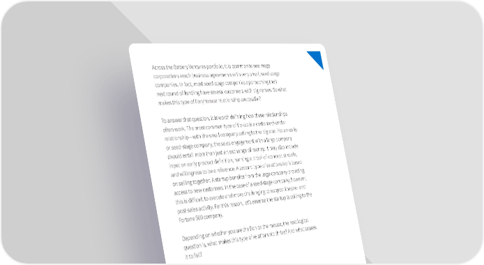 Across the Battery Ventures portfolio, it is common to see mega corporations reach business agreements with very small, seed-stage companies. In fact, most seed-stage companies approaching their next round of funding have several customers with big names. So what makes this type of lion/mouse relationship successful? To answer that question, it is worth deifning how these relationships otfen work. The most common type of tie-up is a customer/vendor relationship—with the small company selling to the big one. For an early- or seed-stage company, the sales engagement with a large company should entail more than just an exchange of money. It may also include input on early product deifnition, running a proof-of-concept at scale, and willingness to be a reference. A second type of relationship is based on selling together: A startup beneifts from the large company providing access to new customers. In the case of a seed-stage company, however, this is difficult to execute and more challenging to support the pre- and post-sales activity. For this reason, let’s assume the startup is selling to the Fortune 500 company. Depending on whether you are the lion or the mouse, the next logical question is, what makes this type of relationship thrive? And what causes it to fail? “It is common to see mega corporations reach business agreements with very small, seed-stage companies.” 10