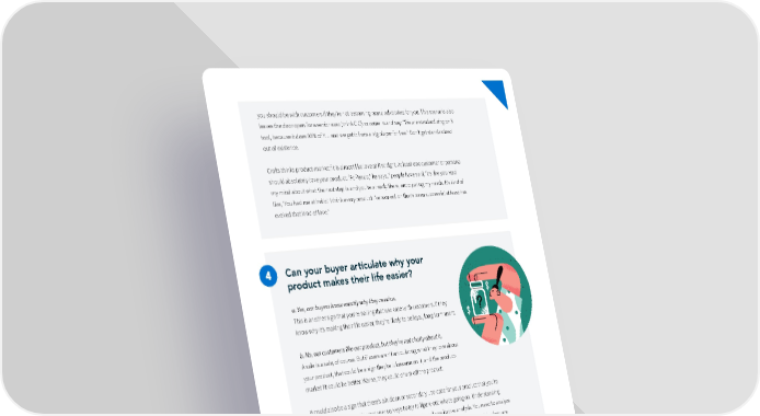 you should be with customers if they’re not becoming brand advocates for you. This scenario also leaves the door open for a senior exec (think CIO) to come in and say: “We are standardizing on X tool, because it does 90% of Y… and we get it from a big player for free.” Don’t get standardized out of existence. Crotfs thinks product-market ift is almost like love at ifrst sight. At least one customer or persona should absolutely love your product. “At Pendo,” he says, “people have said, ‘It’s like you read my mind about what the next step is and you’re already there, anticipating my needs. It’s kind of like, ‘You had me at hello.’ I think every product I’ve worked on that’s been successful at least has evoked that kind of love.” Can your buyer articulate why your product makes their life easier? a. Yes, our buyers know exactly why they need us. This is another sign that you’re nailing that use case with customers. If they know why it’s making their life easier, they’re likely to be loyal, long-term users. b. No, our customers like our product, but they’re not chatty about it. A sale is a sale, of course. But if users aren’t articulating what they love about your product, that could be a sign they’re lukewarm on it, and the product- market ift could be better. Worse, they could churn off the product. It could also be a sign that there’s a hidden or secondary use-case for your product that you’re unaware of. Drill down in your user surveys to try to ifgure out what’s going on. Understanding your customer, Crotfs says, requires both quantitative and qualitative analysis. You need to analyze the data—time on site, number of visits, net-promoter score, and all those other metrics (you are collecting this data, right?)—and you also need to tap into how customers feel about the product. A product that achieved true market ift should meet the 40% rule: “When you talk to customers, you want at least 40% or above saying that they would be very disappointed if you took the product away from them,” Crotf says. 23