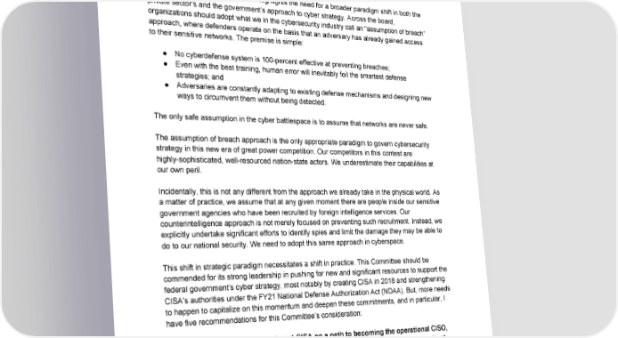 intelligence services leverage supply chain attacks in the past, and we can expect them to incorporate valuable lessons from this latest Russian action into their own operations. Recommendations This Holiday Bear operation further highlights the need for a broader paradigm shift in both the private sector’s and the government’s approach to cyber strategy. Across the board, organizations should adopt what we in the cybersecurity industry call an “assumption of breach” approach, where defenders operate on the basis that an adversary has already gained access to their sensitive networks. The premise is simple: ● No cyberdefense system is 100-percent effective at preventing breaches; ● Even with the best training, human error will inevitably foil the smartest defense strategies; and ● Adversaries are constantly adapting to existing defense mechanisms and designing new ways to circumvent them without being detected. The only safe assumption in the cyber battlespace is to assume that networks are never safe. The assumption of breach approach is the only appropriate paradigm to govern cybersecurity strategy in this new era of great power competition. Our competitors in this contest are highly-sophisticated, well-resourced nation-state actors. We underestimate their capabilities at our own peril. Incidentally, this is not any different from the approach we already take in the physical world. As a matter of practice, we assume that at any given moment there are people inside our sensitive government agencies who have been recruited by foreign intelligence services. Our counterintelligence approach is not merely focused on preventing such recruitment. Instead, we explicitly undertake significant efforts to identify spies and limit the damage they may be able to do to our national security. We need to adopt this same approach in cyberspace. This shift in strategic paradigm necessitates a shift in practice. This Committee should be commended for its strong leadership in pushing for new and significant resources to support the federal government’s cyber strategy, most notably by creating CISA in 2018 and strengthening CISA’s authorities under the FY21 National Defense Authorization Act (NDAA). But, more needs to happen to capitalize on this momentum and deepen these commitments, and in particular, I have five recommendations for this Committee’s consideration: 1. Congress should take steps to set CISA on a path to becoming the operational CISO, or Chief Information Security Officer, of the civilian federal government. The majority of the 137 Executive agencies lack the personnel, the knowhow, and the resources to execute a comprehensive cybersecurity strategy. Congress took an important step toward centralizing federal cybersecurity strategy by creating CISA in DHS in 2018, but the next step is to give CISA both the authority and the resources that it needs to effectively execute its mission. 4