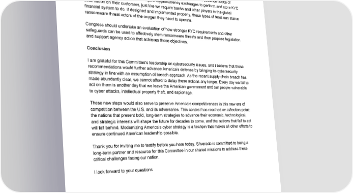 goods. The international community has already taken some steps to strengthen KYC requirements. In June of 2019, the intergovernmental Financial Action Task Force (FATC) issued guidance recommending that virtual asset service providers, including crypto exchanges, share information about their customers with one another when transferring funds between firms. In December 2020, the U.S. Treasury Department published an advance notice of proposed rulemaking that would require cryptocurrency exchanges to perform and store KYC information on their customers, just like we require banks and other players in the global financial system to do. If designed and implemented properly, these types of tools can starve ransomware threat actors of the oxygen they need to operate. Congress should undertake an evaluation of how stronger KYC requirements and other safeguards can be used to effectively stem ransomware threats and then propose legislation and support agency action that achieves those objectives. Conclusion I am grateful for this Committee’s leadership on cybersecurity issues, and I believe that these recommendations would further advance America’s defense by bringing its cybersecurity strategy in line with an assumption of breach approach. As the recent supply chain breach has made abundantly clear, we cannot afford to delay these actions any longer. Every day we fail to act on them is another day that we leave the American government and our people vulnerable to cyber attacks, intellectual property theft, and espionage. These new steps would also serve to preserve America’s competitiveness in this new era of competition between the U.S. and its adversaries. This contest has reached an inflection point: the nations that present bold, long-term strategies to advance their economic, technological, and strategic interests will shape the future for decades to come, and the nations that fail to act will fall behind. Modernizing America’s cyber strategy is a linchpin that makes all other efforts to ensure continued American leadership possible. Thank you for inviting me to testify before you here today. Silverado is committed to being a long-term partner and resource for this Committee in our shared missions to address these critical challenges facing our nation. I look forward to your questions. 7