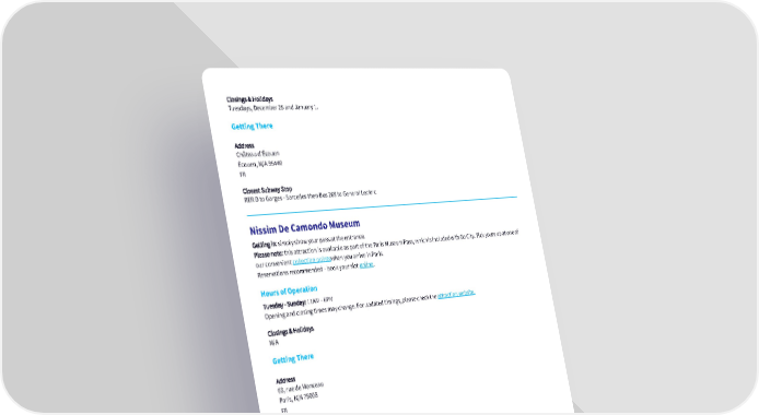 Closings & Holidays Tuesdays, December 25 and January 1. Getting There Address Château d'Écouen Écouen, N/A 95440 FR Closest Subway Stop RER D to Garges - Sarcelles then Bus 269 to General Leclerc Nissim De Camondo Museum Getting in: simply show your pass at the entrance. Please note: this attraction is available as part of the Paris Museum Pass, which is included with Go City. Pick yours up at one of our convenient collection pointswhen you arrive in Paris. Reservations recommended - book your slot online. Hours of Operation Tuesday - Sunday: 11AM - 6PM Opening and closing times may change. For updated timings, please check the attraction website. Closings & Holidays N/A Getting There Address 63, rue de Monceau Paris, N/A 75008 FR Closest Bus Stop 20, 30 or 93 to Malesherbes - Courcelles Closest Subway Stop Line 2 to Monceau Notre Dame and the Archeological Crypt Experience Getting in: meet your guide in the square outside Notre Dame - Place Jean-Paul II Parvis and present your pass and booking information for scanning. Hours of Operation Tuesday - Sunday: 10AM, 11:30AM, 1PM & 2:30PM Closings & Holidays Monday