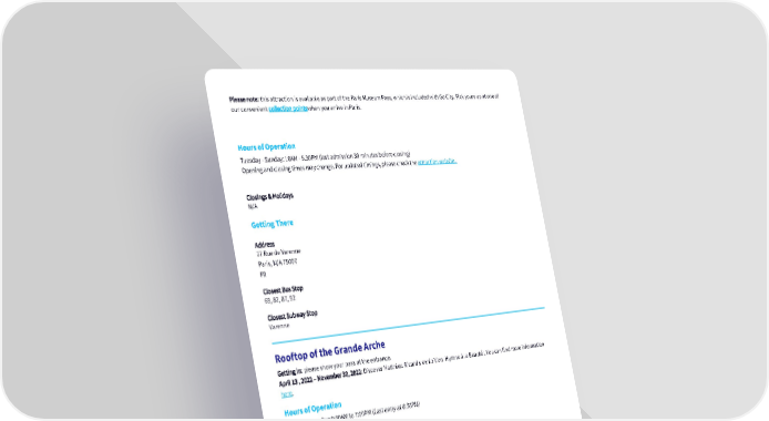 Please note: this attraction is available as part of the Paris Museum Pass, which is included with Go City. Pick yours up at one of our convenient collection pointswhen you arrive in Paris. Hours of Operation Tuesday - Sunday: 10AM - 5.30PM (last admission 30 minutes before closing) Opening and closing times may change. For updated timings, please check the attraction website. Closings & Holidays N/A Getting There Address 77 Rue de Varenne Paris, N/A 75007 FR Closest Bus Stop 69, 82, 87, 92 Closest Subway Stop Varenne Rooftop of the Grande Arche Getting in: please show your pass at the entrance. April 13 , 2022 – November 30, 2022: Discover Matthieu Ricard's exhibition 'Hymne à la Beauté'. You can find more information here. Hours of Operation Tuesday - Sunday: 9:30AM to 7:00PM (Last entry at 6:30PM) Closings & Holidays July 14 Getting There Address 1 Parvis de la Défense Puteaux, N/A 92800 FR Closest Subway Stop La Défense (Line 1, RER A) Sainte-Chapelle Please note: this attraction is available as part of the Paris Museum Pass, which is included with Go City. Pick yours up at one of our collecting points when you arrive in the city.