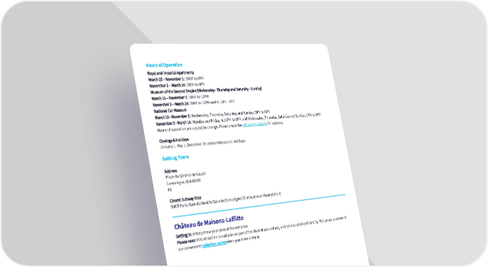 Hours of Operation Royal and Imperial Apartments March 15 – November 1: 10AM to 6PM November 2 – March 14: 10AM to 4PM Museum of the Second Empire (Wednesday - Thursday and Saturday - Sunday) March 15 – November 1: 10AM to 12PM November 2 – March 14: 10AM to 12PM and 4.15PM - 6PM National Car Museum March 15 - November 1: Wednesday, Thursday, Saturday and Sunday: 2PM to 6PM November 2 - March 14: Monday and Friday, 4.15PM to 6PM and Wednesday, Thursday, Saturday and Sunday, 2 PM to 6PM Hours of operation are subject to change. Please check the attraction website for updates. Closings & Holidays January 1, May 1, December 25 and certain public holidays. Getting There Address Place du Général de Gaulle Compiègne, N/A 60200 FR Closest Subway Stop SNCF Paris: Gare du Nord to Gare de Compiègne (10 minute walk from station) Château de Maisons-Laffitte Getting in: simply show your pass at the entrance. Please note: this attraction is available as part of the Paris Museum Pass, which is included with Go City. Pick yours up at one of our convenient collection pointswhen you arrive in Paris. Hours of Operation June 13 to September 15 Wednesday – Monday: 10AM - 12:30PM and 2PM - 6PM September 16 to May 15 Wednesday – Monday: 10AM - 12:30PM and 2PM - 5PM Last admission 30 minutes before closing. Hours of operation are subject to change so please check the attraction websitefor updates. Closings & Holidays January 1, May 1, November 1, November 11 and December 25 Getting There Address