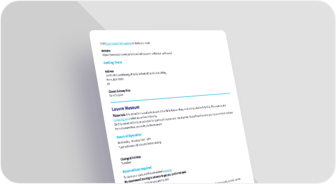 Visit Experience First's website to book your spot. Website: https://www.exp1.com/paris-tours/latin-quarter-selfie-tour-with-pass/ Getting There Address Jardin de Luxembourg, directly in front of the Sénat building. Paris, N/A 75006 FR Closest Subway Stop Saint Sulpice Louvre Museum Please note: this attraction is available as part of the Paris Museum Pass, which is included with Go City. Pick yours up at a collecting point when you arrive in the city. Go City passes will only be accepted for parties of six people or less at a time. You will need to show your Louvre e-ticket and your Paris Museum Pass upon entry to the museum. Hours of Operation Wednesday - Monday: 9AM - 6PM *Last admission 30 minutes before closing Closings & Holidays Tuesdays Reservations required To book your spot, visit the attraction's website. We recommend booking in advance to get your preferred spot! 1. Select the date and time you wish to visit 2. Following the booking instructions 3. Create an account to receive your e-ticket Please note: A Paris Museum Pass number is required to book your visit. It you haven't picked yours up yet, you can use the generic code 2*0000000 Website: https://www.ticketlouvre.fr/louvre/b2c/index.cfm/pmpevent/eventCode/PMP Getting There Address Rue de Rivoli Paris, N/A 75001 FR Closest Subway Stop Louvre – Rivoli