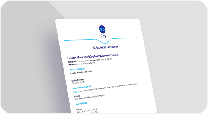 All-Inclusive Guidebook Literary Women Walking Tour with Sweet Tastings Getting in: get your pass scanned by your tour guide at the meeting point. Please note: tours are provided in English. Hours of Operation Thursday - Saturday: 11AM or 3PM Closings & Holidays Sunday - Wednesday Reservations required Click here to book your spot on a tour. (Dont forget to cancel if you change your mind or can no longer make it.) Website: http://www.womenofparis.fr/sugar-spice-go-city Getting There Address Saint-Germain-Des-Prés church 3 Place Saint-Germain-Des-Prés Paris, N/A 75006 FR Closest Bus Stop Take the 63 or 87 bus and get off at Saint-Germain-des-Prés Church. Closest Subway Stop Saint-Germain-des-Prés (line 4), Mabillon (line 10) or Sèvres-Babylone (line 12) 1-Day Big Bus Paris Hop-On Hop-Off Tour Getting in: please show your pass to the bus conductor as you board. Hours of Operation Daily: 10AM – 5PM (buses run every 40 minutes). Check the route map for the locations that you can hop on the bus. Closings & Holidays