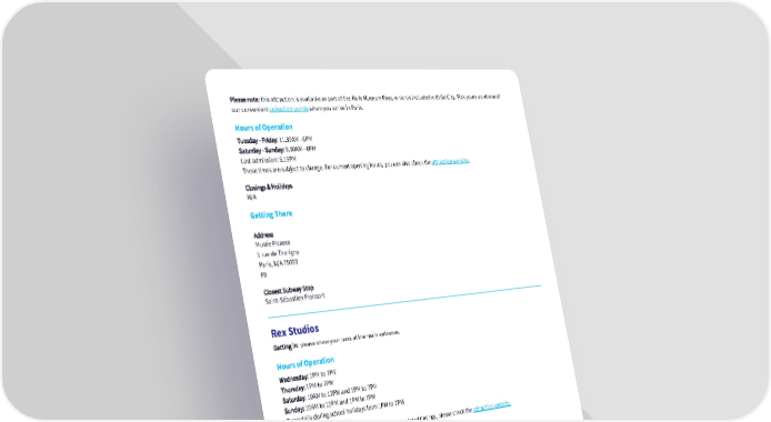 Please note: this attraction is available as part of the Paris Museum Pass, which is included with Go City. Pick yours up at one of our convenient collection points when you arrive in Paris. Hours of Operation Tuesday - Friday: 11.30AM - 6PM Saturday - Sunday: 9.30AM - 6PM Last admission: 5.15PM These times are subject to change. For current opening hours, you can also check the attraction website. Closings & Holidays N/A Getting There Address Musée Picasso 5 rue de Thorigny Paris, N/A 75003 FR Closest Subway Stop Saint-Sébastien Froissart Rex Studios Getting in: please show your pass at the main entrance. Hours of Operation Wednesday: 1PM to 7PM Thursday: 1PM to 7PM Saturday: 10AM to 12PM and 1PM to 7PM Sunday: 10AM to 12PM and 1PM to 7PM Open daily during school holidays from 1PM to 7PM Tours run every 5 minutes. The opening and closure times may change. For updated timings, please check the attraction website. Closings & Holidays N/A Getting There Address Grand Rex 1 Boulevard Poissonnière Paris, N/A 75002 FR Closest Subway Stop Bonne Nouvelle (lines 8 & 9) Rodin Museum