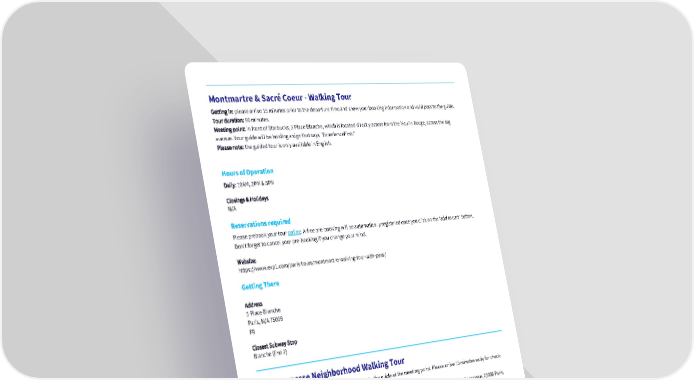Montmartre & Sacré Coeur - Walking Tour Getting in: please arrive 15 minutes prior to the departure time and show your booking information and valid pass to the guide. Tour duration: 90 minutes. Meeting point: in front of Starbucks, 5 Place Blanche, which is located directly across from the Moulin Rouge, across the big avenue. Your guide will be holding a sign that says "ExperienceFirst." Please note: the guided tour is only available in English. Hours of Operation Daily: 10AM, 2PM & 5PM Closings & Holidays N/A Reservations required Please prebook your tour online. A free pre-booking will be automatically registered once you click on the 'add to cart' button. Don't forget to cancel your pre-booking if you change your mind. Website: https://www.exp1.com/paris-tours/montmartre-walking-tour-with-pass/ Getting There Address 5 Place Blanche Paris, N/A 75009 FR Closest Subway Stop Blanche (line 2) Montparnasse Neighborhood Walking Tour Getting in: show your pass and booking information to the guide at the meeting point. Please arrive 15 minutes early for check- in. Meeting point: please meet your guide in front of the big church at the following address: 91 Bd du Montparnasse, 75006 Paris. Your guide will be holding an orange sign with 'ExperienceFirst' written on it. For easier navigation, you can paste this address into Google Maps: 91 Bd du Montparnasse, 75006 Paris. Please note: the guided tour is only available in English. Duration: 90 minutes Hours of Operation Thursday - Saturday: 3PM Closings & Holidays N/A Reservations required Visit Experience First's website to book your spot. Website: