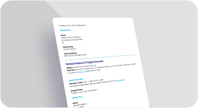 Tuesdays, January 1, May 1 and December 25 Getting There Address Château-Place Charles de Gaulle Saint-Germain-en-Laye, N/A 78100 FR Closest Bus Stop 258 from La Défense Closest Subway Stop RER line A to Saint-Germain-en-Laye National Museum Of Eugéne Delacroix Getting in: simply show your pass at the entrance. Please note: this attraction is available as part of the Paris Museum Pass, which is included with Go City. Pick yours up at one of our convenient collection pointswhen you arrive in Paris. Hours of Operation Wednesday - Monday: 9.30AM - 11.30AM and 1PM - 5.30PM Opening and closing times may change. For updated timings, please check the attraction website. Closings & Holidays Tuesdays, January 1, May 1 and December 25. Getting There Address 6 Rue de Furstemberg Paris, N/A 75006 FR Closest Bus Stop 39, 63, 70, 86, 95, 96 Saint-Germain-des-Prés Closest Subway Stop Line 4 to Saint-Germain-des-Prés National Museum of the Renaissance Getting in: simply show your pass at the entrance. Please note: this attraction is available as part of the Paris Museum Pass, which is included with Go City. Pick yours up at one of our convenient collection pointswhen you arrive in Paris. Hours of Operation Wednesday - Monday: 9.30AM - 12.45PM, and 2PM - 5.45PM Opening and closing times may change. For updated timings, please check the attraction website.