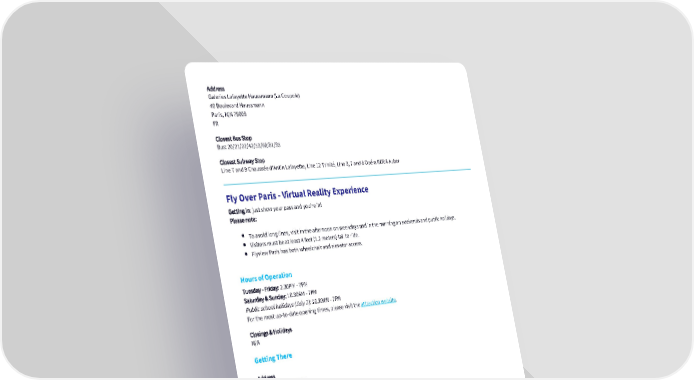 Address Galeries Lafayette Haussmann (La Coupole) 40 Boulevard Haussmann Paris, N/A 75009 FR Closest Bus Stop Bus: 20/21/22/42/53/68/81/95 Closest Subway Stop Line 7 and 9 Chaussée d'Antin Lafayette, Line 12 Trinité, Line 3, 7 and 8 Opéra RER A Auber Fly Over Paris - Virtual Reality Experience Getting in: just show your pass and you're in! Please note: To avoid long lines, visit in the afternoon on weekdays and in the morning on weekends and public holidays. Visitors must be at least 4 feet (1.2 meters) tall to ride. Flyview Paris has both wheelchair and elevator access. Hours of Operation Tuesday - Friday: 2.30PM - 7PM Saturday & Sunday: 10.30AM - 7PM Public school holidays (July 7): 10.30AM - 7PM For the most up-to-date opening times, please visit the attraction website. Closings & Holidays N/A Getting There Address 30 rue du 4 septembre Paris, N/A 75002 FR Closest Bus Stop 20, 21, 22, 52, 81 to Opéra Closest Subway Stop Opéra (Metro 3, 7, 8) - Quatre Septembre (Metro 3) French Apéro in Saint-Germain-des-Prés Getting in: simply present your pass upon arrival – no pre-booking required (subject to availability on the day – you may have to wait for a table.) Hours of Operation The cocktail offer with your pass is available: Monday – Friday: 2:30PM – 6PM Closings & Holidays