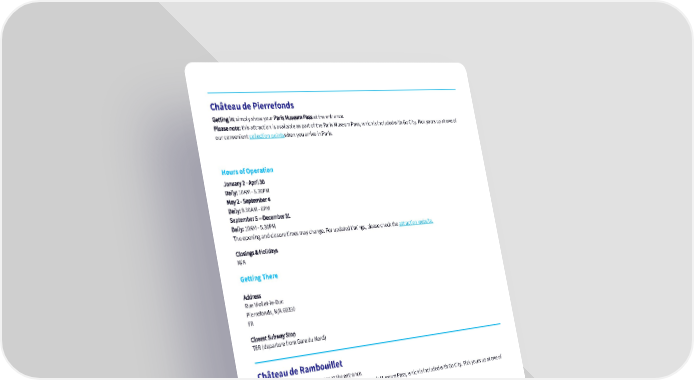 Château de Pierrefonds Getting in: simply show your Paris Museum Pass at the entrance. Please note: this attraction is available as part of the Paris Museum Pass, which is included with Go City. Pick yours up at one of our convenient collection pointswhen you arrive in Paris. Hours of Operation January 2 - April 30 Daily: 10AM - 5.30PM May 2 - September 4 Daily: 9.30AM - 6PM September 5 –-December 31 Daily: 10AM - 5.30PM The opening and closure times may change. For updated timings, please check the attraction website. Closings & Holidays N/A Getting There Address Rue Viollet-le-Duc Pierrefonds, N/A 60350 FR Closest Subway Stop TER (departure from Gare du Nord) Château de Rambouillet Getting in: simply show your pass at the entrance. Please note: this attraction is available as part of the Paris Museum Pass, which is included with Go City. Pick yours up at one of our convenient collection points when you arrive in Paris. Hours of Operation Daily: 10AM - 12PM (last admission 11AM) and 1.30PM - 5.30PM (last admission 4.15PM). Opening and closing times may change. For updated timings, please check the attraction website. Closings & Holidays N/A Getting There Address