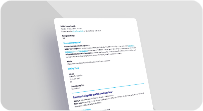 Guided tours in English: Monday - Friday: 2.30PM - 5.30PM. Please check the attraction website for the most up-to-date hours. Closings & Holidays N/A Reservations required There are two options for this experience: Guided tour in English: this is extremely popular and gets booked up fast. If this is one of your must-sees, please reserve your spot on Les Caves du Louvre' website at least a week in advance. If you've got children with you, please book a non-drinker spot. Self-guided tour (available in 8 languages): you do not need to book if you wish to do the self-guided audio tour. Children and teenagers may be able to accompany their parents in the tasting room if there is space available. Website: https://www.cavesdulouvre.com/en/degustation/paris-pass-experience/ Getting There Address 52 Rue de l'Arbre Sec Paris, N/A 75001 FR Closest Subway Stop Louvre Rivoli Galeries Lafayette guided heritage tour Getting in: show your pass and Galeries Lafayette e-ticket on arrival. Please note: The meeting point for the tour is in front of the Coiffirst salon’s ‘Porte Lafayette’ door, at the corner of Boulevard Haussmann and Rue de la Chaussée d’Antin. Hours of Operation Tours operate in French on alternating Sundays at 10AM Tours operate in English on alternating Saturdays at 9:30AM Please check availability on the booking calendar. Closings & Holidays N/A Reservations required Please book your chosen time slot in advance on the Galeries Lafayette websiteby selecting your date and time, using the promo code GOCITY to confirm your reservation. Please do not select the 'buy as a gift' option as this will not book your slot. Website: https://haussmann.galerieslafayette.com/en/events/guided-heritage-tour/ Getting There Address