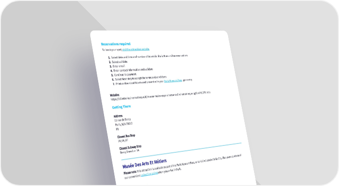 Reservations required To book your spot, visit the attraction website. 1. Select date and time and number of tickets for Paris Museum Pass reservations 2. Select validate 3. Enter email 4. Enter contact information and validate 5. Continue to payment 6. Select Next step to accept the terms and conditions 7. Print or download tickets and present with your Paris Museum Pass upon entry Website: https://billetterie.cinematheque.fr/musee-melies-expo-cinema-css5-cinematheque-pg51-ei791579.html Getting There Address 51 rue de Bercy Paris, N/A 75012 FR Closest Bus Stop 24, 64, 87 Closest Subway Stop Bercy lines 6 or 14 Musée Des Arts Et Métiers Please note: this attraction is available as part of the Paris Museum Pass, which is included with Go City. Pick yours up at one of our convenient collection pointswhen you arrive in Paris. Hours of Operation Tuesday - Thursday and Saturday - Sunday: 10AM - 6PM Friday: 10AM - 9PM Opening and closing times may change. For updated timings, please check the official attraction page. Closings & Holidays January 1, May 1 and December 25 Getting There Address 60 Rue Réaumur Paris, N/A 75003 FR Closest Bus Stop Lines 38 and 39 to boulevard Sébastopol, Lines 20, 47 and 38 to rue Réaumur Closest Subway Stop
