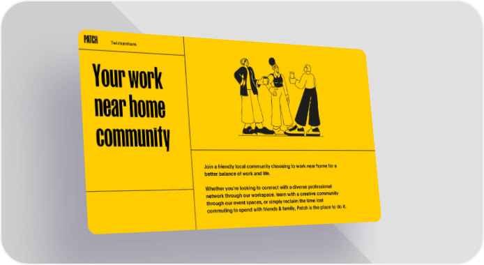 Twickenham Your work near home community Join a friendly local community choosing to work near home for a better balance of work and life. Whether you're looking to connect with a diverse professional network through our workspace, learn with a creative community through our event spaces, or simply reclaim the time lost commuting to spend with friends & family, Patch is the place to do it.