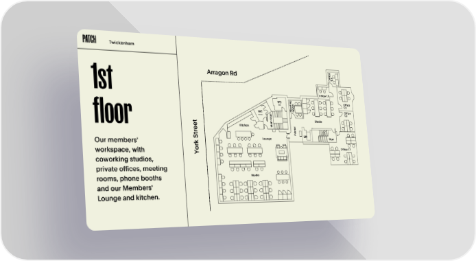 Twickenham e c i f f 4 Arragon Rd . O 1 1st Office 1.5 g WC n Office i Men t m 1.3 e o e o M R Office WC r i 1.2 Women a t S Studio n t i a floor e Kitchen r M e t e n i r r t P Lift S Lounge Stair Our members' k r o Office 1.1 workspace, with Y coworking studios, private offices, meeting Studio rooms, phone booths and our Members' Lounge and kitchen.