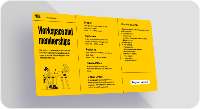 Twickenham Member benefits Drop In One-day-a-month access to our Superfast, secure wifi with your own VLAN coworking studio. Phone booths From £24 + VAT a month. Second screens Free printing Workspace and Associate Unlimited tea & freshly brewed coffee Meeting rooms 4, 8 or unlimited day-per-month Event spaces access to our coworking studio. Free printing From £89 + VAT a month. memberships Flexible terms Breakout areas, kitchenettes Resident Member lounges Our variety of workspaces and flexible Your own dedicated desk and formal Member discounts memberships are designed to suit all task chair. Dog friendly types of worker. Find the option that From £289 + VAT per month. Bike parking works best for you. Bespoke furniture Private Office A secure space to grow your business. With capacity of up to 12. POA. Virtual Office A registered business address to simplify administration & maintain a Register Interest presence in the heart of Twickenham. From £30 + VAT per month.