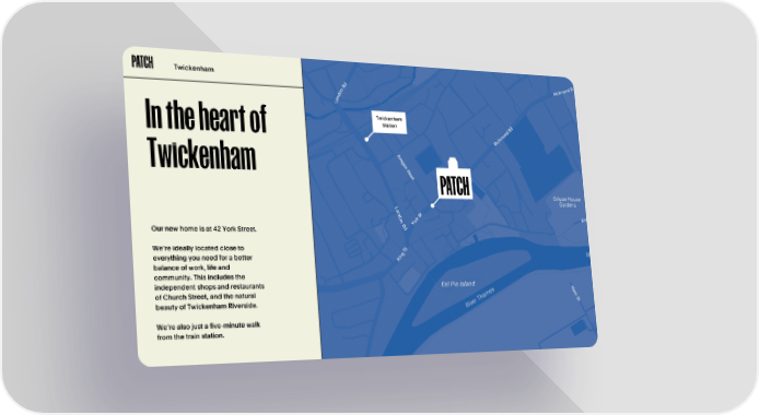 Twickenham Twickenham Station In the heart of Twickenham Our new home is at 42 York Street. We’re ideally located close to everything you need for a better balance of work, life and community. This includes the independent shops and restaurants of Church Street, and the natural beauty of Twickenham Riverside. We’re also just a five-minute walk from the train station.