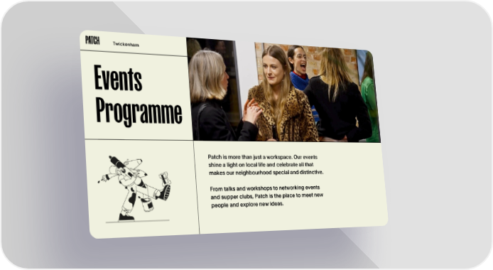 Twickenham Events Programme Patch is more than just a workspace. Our events shine a light on local life and celebrate all that makes our neighbourhood special and distinctive. From talks and workshops to networking events and supper clubs, Patch is the place to meet new people and explore new ideas.
