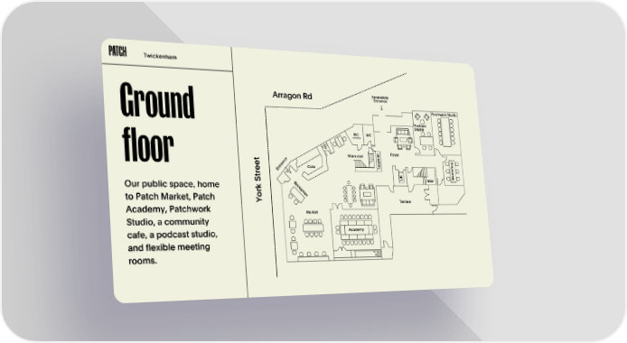 Twickenham Accessible Entrance Arragon Rd Patchwork Studio Ground Podcast Studio WC WC Accessible t Foyer n Main stair i o t e p p c n a o floor e a e r h t Cafe T s n e k E r r o t t f i W L Stair S R e c Our public space, home e k p r t i o n o to Patch Market, Patch Y Terrace Academy, Patchwork Market Studio, a community Academy cafe, a podcast studio, and flexible meeting rooms.
