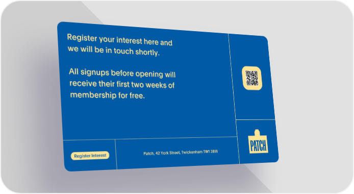 Register your interest here and we will be in touch shortly. All signups before opening will receive their first two weeks of membership for free. Patch, 42 York Street, Twickenham TW1 3BW Register Interest