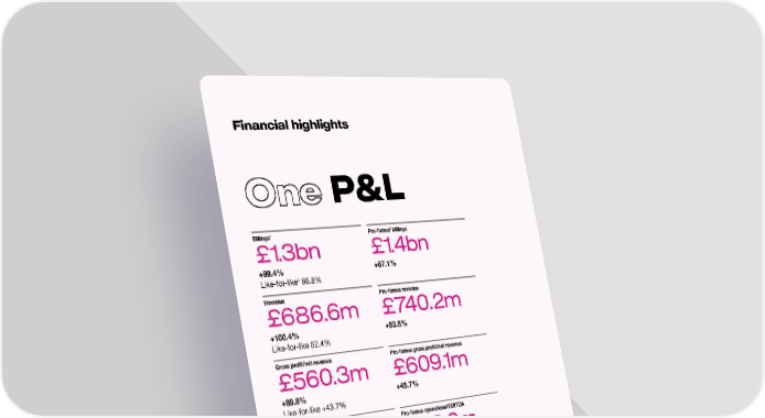 Financial highlights One P&L 1 3 Billings Pro-forma billings £1.3bn £1.4bn +99.4% +67.1% 2 Like-for-like 66.8% Revenue Pro-forma revenue £686.6m £740.2m +100.4% +53.8% Like-for-like 52.4% Gross profit/net revenue Pro-forma gross profit/net revenue £560.3m £609.1m +89.8% +45.7% Like-for-like +43.7% 4 Operational EBITDA Pro-forma operational EBITDA £101.0m £113.0m +62.4% +16.8% Like-for-like +11.9% 5 Operational EBITDA margin Pro-forma operational EBITDA margin +18.0% 18.6% -3.0 margin points -4.6 margin points Like-for-like -5.1 margin points Operating loss Pro-forma operating loss -£42.1m -£83.5m 2020 +£8.1m 2020 -£87.9m 2 S4Capital Annual Report and Accounts 2021