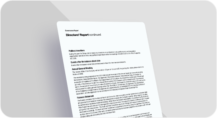 Governance Report Directors’ Report continued Political donations During the year the Group did not make any donations or contributions to any political party or other political organisation and did not incur any political expenditure within the meanings of sections 362 to 379 of the Companies Act 2006. Events after the balance sheet date Events after the balance sheet date are disclosed in Note 28 to the financial statements. Annual General Meeting The ‘hybrid’ AGM of the Company will be held at 1.00 pm on 16 June 2022. For participation details please refer to the Notice of AGM. The resolutions being proposed at the 2022 AGM include the receipt of this Annual Report and Accounts including the Directors’ Remuneration Report, the approval of the revised Directors’ Remuneration Policy, the election or re-election of members of the Board, the reappointment of the auditors, the renewal for a further year of the limited authority of the Directors to allot the unissued share capital of the Company and the disapplication of pre-emption rights, the renewal of the authority to make off-market purchases, the request for shareowner approval to reduce the notice period for calling general meetings (other than the AGM) to 14 clear days, the approval of the capitalisation of the Company’s merger reserve, the approval of a capital reduction, an amendment to the Company’s articles of association, and the approval of a new schedule to the Company’s Employee Share Ownership Plan. Fairness Statement The Board considers that the Annual Report and Accounts, taken as a whole, are fair, balanced and understandable and provide the information necessary for shareowners to assess the Company’s position and prospects, including its performance, business model and strategy. While this is the Board’s responsibility, it is overseen by the Audit and Risk Committee who ensure that management’s disclosures reflect the supporting detail or challenge them to explain and justify their interpretation. The Audit and Risk Committee reports its findings and makes recommendations to the Board accordingly. The Audit and Risk Committee is supported in this role by using the expertise of the statutory auditor, who in the course of the audit, considers whether accounts have been prepared in accordance with IFRS and whether adequate accounting records have been kept. Going concern The Group’s business activities, together with the factors likely to affect its future development, performance and position are set out on pages 8 to 38. The financial position of the Group, its billings, gross profit and profitability are described on page 98 onwards. In addition, Note 5 to the Group financial statements include the Group’s objectives, policies and processes for managing its capital and financial risk, its financial risk management objectives, details of its financial instruments and hedging activities and its exposures to credit risk and liquidity risk. Having considered the Group’s cash flows, liquidity position and borrowing facilities, the Board has a reasonable expectation that the Company and Group have adequate resources to meet their financial obligations as they fall due for a period of at least 12 months from the date of signing these financial statements and future and have therefore continued to adopt the going concern basis in preparing these financial statements. For further details on going concern see Note 2 on page 113. Independent auditors PricewaterhouseCoopers LLP has confirmed its willingness to continue as auditors of the Group. In accordance with section 489 of the Companies Act 2006, separate resolutions for the appointment of PricewaterhouseCoopers LLP as auditors of the Group and for the Directors to determine its remuneration will be proposed at the forthcoming AGM of the Company. 96 S4Capital Annual Report and Accounts 2021