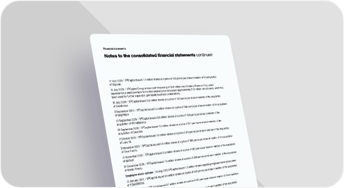Financial statements N otes to the consolidated financial statements continued 17 July 2020 // S4Capital issued 1.1 million shares at a price of 200 pence per share in relation of the acquisition of Digodat. 16 July 2020 // S4Capital Group announced the placing of 36.8 million new Ordinary Shares at 315p, which represented a small premium to the then market price and raised approximately £113 million net proceeds, which has been used for further expansion, principally business combinations. 31 July 2020 // S4Capital issued 0.5 million shares at a price of 152 pence per share in relation of the acquisition of Datalicious. 3 September 2020 // S4Capital issued 0.5 million shares at a price of 344 pence per share in relation of the acquisition of Brightblue. 10 September 2020 // S4Capital issued 0.6 million shares at a price of 198 pence per share in relation of the acquisition of WhiteBalance. 29 September 2020 // S4Capital issued 1.0 million shares at a price of 377 pence per share in relation of the acquisition of Dare.Win 2 October 2020 // S4Capital issued 1.0 million shares at a price of 316 pence per share in relation of the acquisition of Lens 10. 3 November 2020 // S4Capital issued 0.6 million shares at a price of 389 pence per share in relation of the acquisition of Orca Pacific. 12 November 2020 // S4Capital issued 0.5 million shares at a price of 369 pence per share in relation of the acquisition of BizTech. 31 December 2020 // S4Capital issued 7.4 million shares at a price of 494 pence per share in relation of the acquisition of Metric Theory. Employee stock options // During 2020 S4Capital issued 1.3 million shares regarding employee stock option plans. 13 January 2021 // S4Capital issued 0.5 million shares at a price of 536 pence per share in relation of the acquisition of TOMORROW. 22 January 2021 // S4Capital issued 0.7 million shares at a price of 512 pence per share in relation of the acquisition of STAUD. 16 April 2021 // S4Capital issued 0.7 million shares at a price of 580 pence per share in relation of the acquisition of WhiteBalance. 19 April 2021 // S4Capital issued 0.6 million shares at a price of 570 pence per share in relation of the acquisition of Digodat. 6 May 2021 // S4Capital issued 0.7 million shares at a price of 580 pence per share in relation of the acquisition of IMAgency. 10 May 2021 // S4Capital issued 3.1 million shares at a price of 566 pence per share in relation of the acquisition of Jam3. 30 July 2021 // S4Capital issued 0.2 million shares at a price of 694 pence per share in relation of the acquisition of Destined. 2 August 2021 // S4Capital issued 0.04 million shares at a price of 706 pence per share in relation of the acquisition of Digodat. 18 August 2021 // S4Capital issued 0.07 million shares at a price of 720 pence per share in relation of the acquisition of TOMORROW. 13 September 2021 // S4Capital issued 1.9 million shares at a price of 791 pence per share in relation of the acquisition of Cashmere. 21 September 2021 // S4Capital issued 1.6 million shares at a price of 804 pence per share in relation of the acquisition of Zemoga. 24 September 2021 // S4Capital issued 0.8 million shares at a price of 805 pence per share in relation of the acquisition of Jam3. 154 S4Capital Annual Report and Accounts 2021