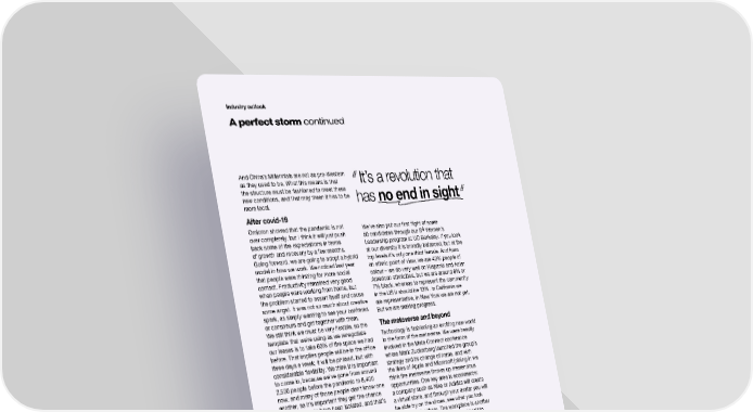 Industry outlook A perfect storm continued And China’s Millennials are not as pro-Western as they used to be. What this means is that It’s a revolution that the structure must be fashioned to meet these new conditions, and that may mean it has to be has no end in sight more local. After covid-19 Omicron showed that the pandemic is not We’ve also put our first flight of some over completely, but I think it will just push 4 50 candidates through our S Women’s back some of the expectations in terms Leadership program at UC Berkeley. If you look of growth and recovery by a few months. at our diversity it is broadly balanced, but at the Going forward, we are going to adopt a hybrid top levels it’s only one third female. And from model in how we work. We noticed last year an ethnic point of view, we are 40% people of that people were thirsting for more social colour – we do very well on Hispanic and Asian contact. Productivity remained very good American ethnicities, but we are around 6% or when people were working from home, but 7% black, whereas to represent the community the problem started to assert itself and cause in the US it should be 13%. In California we some angst. It was not so much about creative are representative, in New York we are not yet. spark, as simply wanting to see your confreres But we are making progress. or consoeurs and get together with them. We still think we must be very flexible, so the The metaverse and beyond template that we’re using as we renegotiate Technology is fashioning an exciting new world our leases is to take 60% of the space we had in the form of the metaverse. We were heavily before. That implies people will be in the office involved in the Meta Connect conference three days a week; it will be phased, but with where Mark Zuckerberg launched the group’s considerable flexibility. We think it is important strategy and its change of name, and with to come in, because we’ve gone from around the likes of Apple and Microsoft joining in we 2,500 people before the pandemic to 8,400 think the metaverse throws up tremendous now, and many of those people don’t know one opportunities. One key area is ecommerce: another, so it’s important they get the chance a company such as Nike or Adidas will create to do so. People have been isolated, and that’s a virtual store, and through your avatar you will not a good thing. be able try on the shoes, see what you look Doing the right thing like, and order them. The workplace is another area where the metaverse will lend itself to The world in which we operate is increasingly application because of the fact that you can dominated by issues such as environment, be anywhere. Last October S4Capital held its governance, diversity and social responsibility. first Executive Committee meeting in our 360 We’ve said that we will be net zero by 2024 degree boardroom in the metaverse, using VR with the help of carbon offsets and we are technology. We are heavily involved in exploring close to that. We’re making progress on our the potential of other nascent technologies objective to achieve B Corp accreditation. such as Epic Games’ Unreal Engine. We’ve signed both Amazon’s Climate Pledge 4 and the World Economic Forum pledge, S Capital was established with the ambition to among other commitments in the climate and be the leading player in the new era of tech-led, environmental area. In terms of governance, digital-only advertising; it’s a revolution that has we’re having to build out our structures in no end in sight. terms of legal compliance, risk and other disciplines because we’ve gone from zero to a £1.7 billion/$2.1 billion market cap in a short time. On the diversity and inclusion side, we’ve implemented our Fellowship programme. We had our first flight of fellows from the historically black universities like Howard and Morehouse and we are expanding it to black high schools. 46 S4Capital Annual Report and Accounts 2021