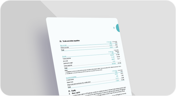 3 20. Trade and other payables 31 Dec 2021 31 Dec 2020 Non-current £000 £000 Other accruals 2,845 1,941 Total 2,845 1,941 31 Dec 2020 1 31 Dec 2021 Restated Current £000 £000 Trade payables 204,985 127,344 Accruals 51,446 33,954 Deferred income2 58,887 29,771 Other payables 8,741 – Total 324,059 191,069 Notes: 1. Restated for the initial accounting for the business combinations of Decoded and Metric Theory as required by IFRS 3. Details are disclosed in Note 4. 2. The deferred income as at 31 December 2020 has been fully recognised in the results of 2021. 31 Dec 2021 31 Dec 2020 Current tax liabilities £000 £000 Income taxes 6,550 5,874 Sales taxes 838 1,008 Wage taxes and social security contributions 10,112 5,598 Total 17,500 12,480 21. Equity A. Share capital The authorised share capital of S4Capital plc contains an unlimited number of Ordinary Shares having a nominal value of £0.25 per Ordinary Share. At the end of the reporting period, the issued and paid up share capital of S4Capital plc consisted of 555,307,572 (2020: 542,065,458) Ordinary Shares having a nominal value of £0.25 per Ordinary Share. The changes in issued share capital, share premium, merger reserves and treasury shares of S4Capital plc (formerly Derriston Capital plc) is summarised in the consolidated statement of changes in equity on page 112. 28 September 2018 // S4Capital issued 1 B share at a price of 100 pence per share to Sir Martin Sorrell. Please see the Governance Report on page 61 for details. 12 March 2020 // S4Capital issued 10.4 million shares at a price of 186 pence per share in relation to the acquisition of Circus. 16 April 2020 // S4Capital issued 1.0 million shares at a price of 25 pence per share in relation of the acquisition of Circus. 24 April 2020 // S4Capital issued 1.0 million shares at a price of 148 pence per share in relation of the acquisition of Conversion works. 19 May 2020 // S4Capital issued 6.5 million shares at a price of 171 pence per share in relation of the acquisition of Firewood. 11 June 2020 // S4Capital issued 0.6 million shares at a price of 241 pence per share in relation of the acquisition of Progmedia. 21 June 2020 // S4Capital issued 0.2 million shares at a price of 369 pence per share in relation of the acquisition of BizTech Russia & Kazakhstan. 24 June 2020 // S4Capital issued 0.8 million shares at a price of 234 pence per share in relation of the acquisition of IMAgency. S4Capital Annual Report and Accounts 2021 153
