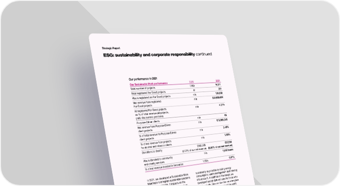 Strategic Report ESG: sustainability and corporate responsibility continued Our performance in 2021 Our Sustainable Work performance 2020 2021 Total number of projects 7,800 14,311 Total registered For Good projects 41 251 Hours registered on For Good projects n/a 123,059 Net revenue from registered n/a £23,609,684 For Good projects All registered For Good projects n/a 4.21% as % of total revenue (all projects, paid, discounted, pro bono) Purpose-Driven clients n/a 69 Net revenue from Purpose-Driven n/a £13,952,540 client projects % of total revenue for Purpose-Driven n/a 2.49% client projects % of net revenue from projects n/a 0.93% for alcohol and tobacco clients Donations to charity £356,568 £87,090 (0.12% of our net revenue) (0.02% of our net revenue) Hours donated to community n/a 1,460 hours and charity services % of net revenue invested in innovation 1.23% 0.07% In 2021, we developed a Sustainable Work sustainably as possible by taking energy Manifesto to integrate sustainable solutions consumption, waste management and catering more systematically. It impacts on the into account. In addition to the design, we materials we use, our activities, such as developed sustainable set rules for those who business flights, as well as the end product use the studio. This can function as a template we deliver. Options such as a production that for other production hubs around the world. is mobile-first or a product that only enables Inclusion and representation the consumer to watch the content when connected to wi-fi, for that reason results in a Working sustainably also means that reduction in energy. Another efficiency gain can we take the social aspects into account. be reached through integrated productions. As digital advertisers and marketers, we can In 2021, more than 20 of our projects were deepen customer connections by ensuring registered as integrated. As these measures that audiences see themselves reflected differ per project, we are working on authentically in our content. It is important separate guidelines. to consider not only who is represented in images, but also how, and adjust for cultural Sustainable film production differences globally. We have developed a As an important part of our client work, film ‘Practical Guide to Inclusive Marketing’, production is included as a separate stream a website created to promote inclusion and within our Sustainable Work Manifesto. representation in the context of marketing In Europe and the US, we are achieving more materials. A team of volunteers researched, sustainable production through, for instance, created content, and designed this publicly the props and set pieces used, how waste accessible resource to help anyone in the is disposed of and what food is served. marketing industry. In the Netherlands we built a film studio as 20 S4Capital Annual Report and Accounts 2021