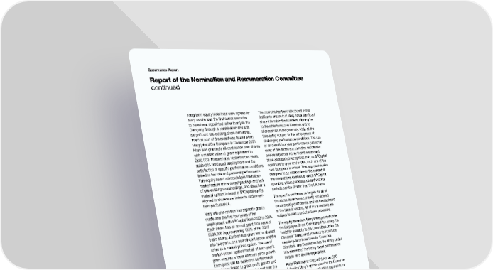 Governance Report Report of the Nomination and Remuneration Committee continued Long-term equity incentives were agreed for The incentive has been structured in this Mary as she was the first senior executive fashion to ensure that Mary has a significant to have been appointed rather than join the share interest in the business, aligning her Company through a combination and with to the other Executive Directors and to a significant pre-existing share ownership. shareowners more generally, while all the The first part of the award was issued when time being subject to the achievement of Mary joined the Company in December 2021. challenging performance conditions. The use Mary was granted a nil-cost option over shares of an overall four year performance period for with a market value at grant equivalent to most of the award structured as successive £500,000. These shares vest after two years, one-year periods rather than the standard subject to continued employment and the three-year period recognises that, as S4Capital satisfaction of specific performance conditions continues to grow and evolve, each one of the linked to her role and personal performance. next four years is critical. This approach is also This equity award acknowledges the below- designed to be competitive in the context of market nature of her overall package and lack the international markets in which S4Capital of pre-existing shareholdings, and gives her a operates, where performance and vesting material upfront interest in S4Capital equity, periods can be shorter than the UK norm. aligned to shareowner interests and longer- The specific performance targets for all of term performance. the above awards are currently considered Mary will also receive four separate grants commercially confidential and will be disclosed made over the first four years of her at the time of vesting. All of the incentives are employment with S4Capital from 2022 to 2025. subject to malus and clawback provisions. Each award has an annual grant face value of The equity awards to Mary were granted under £500,000 (approximately 135% of her 2022 the Employee Share Ownership Plan, using the basic salary). Each annual grant will be divided flexibility available to the Committee under the into two parts, one as a nil-cost option and the Directors’ Remuneration Policy to introduce other as a market-priced option. The use of new long-term incentives for Executive market-priced options for half of each year’s Directors. The Committee has the ability under grant ensures a focus on share price growth. this element of the Policy to set performance Each grant will be subject to performance targets as it deems appropriate. conditions linked to gross profit growth and EBITDA margin which must be met over the Peter Rademaker stepped down as CFO year of grant. Each grant will be capable of following Mary’s appointment to the Board on vesting to the extent that the performance 3 January 2022. He received no payments for conditions are achieved, although no part of loss of office but remained employed by the the award will actually vest before 2026, i.e. Company until 31 January 2022, during which four years after the first grant date. There is no time he received his salary and other benefits. formal post-vesting holding period but Mary Peter will step down from his role as a will be required to build a shareholding up to a Non-Executive Director with effect from the minimum of 200% of basic salary, as specified end of this year’s AGM. in the Remuneration Policy. Pete Kim has also asked to step down from the Board with effect from the end of this year’s AGM but he will remain as Chief Executive Officer of Data.Monks. 68 S4Capital Annual Report and Accounts 2021