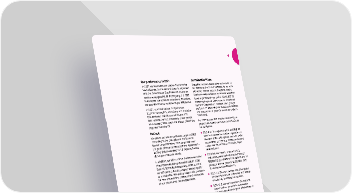 1 Our performance in 2021 Sustainable Work In 2021 we measured our carbon footprint for This pillar revolves around the work we do for Media.Monks for the second time, in alignment our clients and with our partners. As we work with the Greenhouse Gas Protocol. As we are with many brands around the globe, Media. continuously growing as a company, it is hard Monks is well positioned to become a catalyst to compare our absolute emissions. Therefore, for change through our global clients and by we also disclose our emissions per FTE below. attracting Purpose-Driven clients, as defined In 2021, our total carbon footprint was by the B Corporation. For both client groups 3,125.32 tonnes CO emissions and a relative we focus on improving our sustainable creation 2 and production of projects as well as projects CO emission of 0.86 tonne CO per FTE. 2 2 ‘For Good’. This reflects the fact that many of our people were working from home for a large part of the For both sustainable creation and For Good year due to covid-19. projects we aim to contribute to the SDGs as Outlook set out below. We aim to set a science-based target in 2022 • SDG 4.4: Through on-the-job learning, we according to the principles of the Science- want to increase the number of people with Based Target Initiative. This target will meet relevant skills – with special focus on under- the goals of the international Paris Agreement – represented groups (e.g. female developers) limiting global warming to 1.5 degrees Celsius – also see the section on Diversity, Equity above pre-industrial levels. and Inclusion. In addition, we will continue the implementation • SDG 9.4: We want to reduce the CO2 of our Green Building checklist as part of our emissions per unit of value added through Green & Social Building policy. While some of facilitating our clients with an optimal way to our offices (e.g. Kuala Lumpur) already qualify produce and run projects sustainably (our as sustainable, this policy will provide guidance Sustainable Work Manifesto). for new and existing contracts and renovation • SDG 9.5: We want to steer and drive global of our offices that need adjustments. solutions focused on technology and design evolution by investing in innovation. • SDG 12.2: We want to reduce the material footprint of our projects by sustainably managing and increasing the efficient use of We aim to create our project resources. Through the content of our For Good projects, a climate neutral we also contribute to SDGs 1, 4, 5, 10, 12 and environmentally and 13. conscious business S4Capital Annual Report and Accounts 2021 19