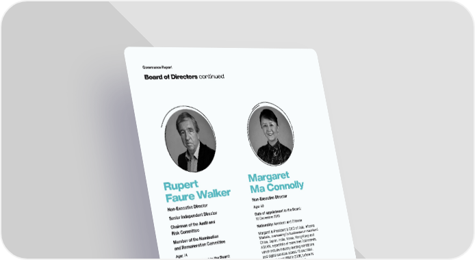Governance Report Board of Directors continued Rupert Margaret Faure Walker Ma Connolly Non-Executive Director Non-Executive Director Senior Independent Director Age: 49 Chairman of the Audit and Date of appointment to the Board: Risk Committee 10 December 2019 Nationality: American and Chinese Member of the Nomination Margaret is President & CEO of Asia, Informa and Remuneration Committee Markets, overseeing its businesses in mainland Age: 74 China, Japan, India, Korea, Hong Kong and Date of appointment to the Board: ASEAN, a portfolio of more than 250 brands, 28 September 2018 which include industry-leading exhibitions and digital services across 13 countries. Nationality: British Margaret joined UBM in 2008, before its Rupert qualified as a Chartered Accountant combination with Informa in 2018. with Peat Marwick Mitchell in 1972. He joined In the last 12 years, she has spearheaded Samuel Montagu in 1977 to pursue a career multiple milestones in key market sectors in corporate finance. Over a period of 34 and successfully grown the business years Rupert advised major corporate through organic development and strategic clients on mergers, acquisitions, IPOs and partnerships. Prior to this, she held senior capital raisings, including advising WPP on positions at TNT and Global Sources, and its acquisitions of JWT, Ogilvy & Mather and is the co-founder of the leading online expat Cordiant, together with related funding. He was community ShanghaiExpat.com. Margaret is appointed a director of Samuel Montagu in a member of Common Purpose Dao Xiang 1982 and was Head of Corporate Finance advisory board and received an MBA degree between 1993 and 1998. from Oxford Brookes Business School. He was a Managing Director of HSBC Investment Banking until his retirement in 2011. 52 S4Capital Annual Report and Accounts 2021