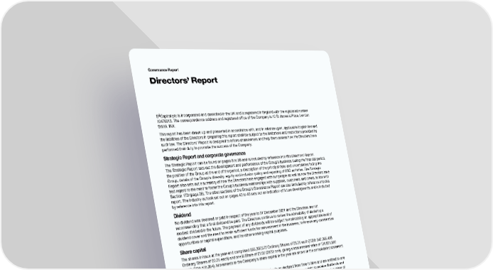 Governance Report Directors’ Report S4Capital plc is incorporated and domiciled in the UK and is registered in England with the registered number 10476913. The correspondence address and registered office of the Company is 12 St James’s Place, London SW1A 1NX. This report has been drawn up and presented in accordance with, and in reliance upon, applicable English law and the liabilities of the Directors in preparing this report shall be subject to the limitations and restrictions provided by such law. The Directors’ Report is designed to inform shareowners and help them assess how the Directors have performed their duty to promote the success of the Company. Strategic Report and corporate governance The Strategic Report can be found on pages 8 to 38 and is included by reference into this Directors’ Report. The Strategic Report sets out the development and performance of the Group’s business during the financial period, the position of the Group at the end of the period, a description of the principal risks and uncertainties facing the Group, details of the Group’s diversity, equity and inclusion policy and reporting of ESG activities. The Strategic Report also sets out a summary of how the Directors have engaged with our people as well as how the Directors have had regard to the need to foster the Group’s business relationships with suppliers, customers and others, in line with Section 172i (page 28). The other sections of the Group’s Governance Report are also included by reference into this report. The industry outlook set out on pages 40 to 46 sets out an indication of future developments and is included by reference into this report. Dividend No dividend was declared or paid in respect of the year to 31 December 2021 and the Directors are not recommending that a final dividend be paid. The Directors continue to review the advisability of declaring a modest dividend in the future. The payment of any dividends will be subject to maintaining an appropriate level of dividend cover and the need to retain sufficient funds for reinvestment in the business, to finance any combination opportunities or capital expenditure, and for other working capital purposes. Share capital The shares in issue at the year-end comprised 555,307,572 Ordinary Shares of £0.25 each (2020: 542,065,458 Ordinary Shares of £0.25 each) and one B Share of £1.00 (2020: one), giving a total nominal value of 138,826,892 (2020: £135,516,364). Movements in the Company’s share capital in the year are shown in the consolidated statement of changes in equity. The holders of Ordinary Shares are entitled to receive dividends as declared from time to time and are entitled to one vote per share at general meetings of the Company. The holder of the B Share has no right to receive dividends and is entitled to one vote at general meetings of the Company when voting in favour of resolutions, and such number of votes as may be required to defeat the relevant resolution when voting against. The Ordinary Shares have a standard listing on the London Stock Exchange. Restrictions on transfer of securities The Ordinary Shares are freely transferable and there are no restrictions on transfer. Except for Sir Martin Sorrell, who holds the B Share, as a result of which he exercises a significant degree of control over the Company (as more fully described in the Governance Report on page 61). No other person holds securities in the Company carrying special rights with regard to control of the Company. The Company is not aware of any agreements between holders of securities that may result in restrictions on the transfer of securities or voting rights. Amendment of Articles of Association Any amendments to the Articles may be made in accordance with the provisions of the Companies Act 2006 by way of special resolution. 92 S4Capital Annual Report and Accounts 2021