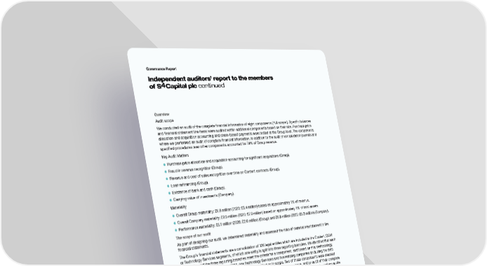 Governance Report Independent auditors’ report to the members 4 of S Capital plc continued Overview Audit scope We conducted an audit of the complete financial information of eight components (‘full scope’). Specific balances and financial statement line items were audited within additional components based on their size. Purchase price allocation and acquisition accounting and share-based payments were tested at the Group level. The components where we performed an audit of complete financial information, in addition to the audit of consolidation journals and specified procedures over other components accounted for 74% of Group revenue. Key Audit Matters • Purchase price allocation and acquisition accounting for significant acquisitions (Group). • Fraud in revenue recognition (Group). • Revenue and cost of sales recognition over time on Content contracts (Group). • Loan refinancing (Group). • Existence of bank and cash (Group). • Carrying value of Investments (Company). Materiality • Overall Group materiality: £6.8 million (2020: £3.4 million) based on approximately 1% of revenue. • Overall Company materiality: £9.0 million (2020: £7.0 million) based on approximately 1% of total assets. • Performance materiality: £5.1 million (2020: £2.6 million) (Group) and £6.8 million (2020: £5.3 million) (Company). The scope of our audit As part of designing our audit, we determined materiality and assessed the risks of material misstatement in the financial statements. The Group’s financial statements are a consolidation of 126 legal entities which are included in the Content, DDM or Technology Services segments, of which one entity is split into three reporting branches. We identified that each legal entity and the three reporting branches meet the criteria for a component, and based on this methodology, 28 components (16 Content, six DDM, one Technology Services and five Holding companies (including the debt holding company and the Parent Company) were identified as in scope. Two of these components were deemed financially significant as their revenue made up more than 10% of the Group revenue, and an audit of their complete financial information was performed by the component auditors. We instructed component teams to perform audits of the complete financial information of a further six entities (bringing the total to eight full scope entities) and 20 were identified as in scope due to having individually large or unusual balances. This includes the entity holding the majority of the Group’s external borrowings which was included in scope due to the individually large balance and its relevance to a significant risk. Our audit scope addressed 74% of Group revenue. Of the 28 components in scope, 18 trading components were audited by component auditors. The remaining five trading components and five Holding companies (including the debt holding company and the Parent Company) were audited by the Group audit team. Opinions were received from our PwC component teams as envisaged with the exception of four Content components, where modified opinions were received in respect of revenue and cost of sales on open contracts, representing approximately 5% of recognised Group revenue, as a result of significant control deficiencies in those components. Following on from the four modified opinions, the Group team performed additional work over revenue and cost of sales in order to reach a conclusion – see the Key Audit Matter in respect of ‘Revenue and cost of sales recognition over time on Content contracts (Group)’ below. Key Audit Matters Key Audit Matters are those matters that, in the auditors’ professional judgment, were of most significance in the audit of the financial statements of the current period and include the most significant assessed risks of material misstatement (whether or not due to fraud) identified by the auditors, including those which had the greatest effect on: the overall audit strategy; the allocation of resources in the audit; and directing the efforts of the engagement team. These matters, and any comments we make on the results of our procedures thereon, were addressed in the context of our audit of the financial statements as a whole, and in forming our opinion thereon, and we do not provide a separate opinion on these matters. This is not a complete list of all risks identified by our audit. 100 S4Capital Annual Report and Accounts 2021